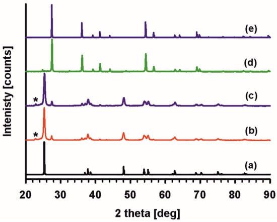 X-ray diffraction patterns of (a) anatase (PDF-03-065-5714), (b) P25, (c) Pz@P25, and (d) Pz@P25 after TGA experiment; and (e) rutile (PDF-01-070-4347). With *, the intensity that can neither be assigned to anatase nor the rutile be marked.