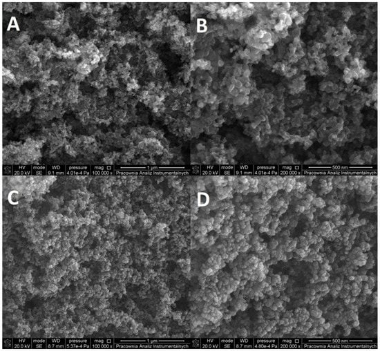 SEM images of Pz@P25 nanoparticles: (A)—magnitude 100,000×; (B)—magnitude 200,000×. SEM images of bare P25 TiO2 21 nm nanoparticles: (C)—magnitude 100,000×; (D)—magnitude 200,000×.