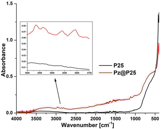 The FTIR–ATR spectrum of bare P25 (black line) and Pz@P25 (red line).