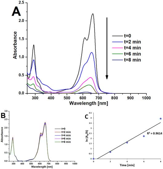 In the case of methylene blue, the UV–Vis spectrophotometer was employed to monitor the very fast photodegradation of this dye. The white light irradiation of a 1 mM solution of MB in water for 8 min was performed in a 10 mL glass vial, and the 1 mL of samples were taken into a 10 mm quartz cuvette every 2 min. The recorded UV–Vis spectra in time are presented in Figure 7A. The results revealed a significant decomposition of methylene blue within 8 min. The observed photodegradation was nearly linear (R2 = 0.9614) (Figure 7C). Due to the known photodegradation ability of MB in the absence of any photocatalysts (photolysis), we also performed control studies, which indicated a very slight decomposition of the dye when irradiated with white light without the Pz@P25 nanosystem (Figure 7B).