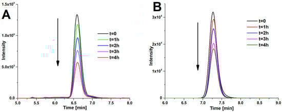 The photodegradation of two other organic compounds—bisphenol A and carbamazepine—was observed with the use of HPLC chromatography according to literature data [41,42]. Furthermore, 1 mM water solutions of each analyte were prepared and irradiated with white light in a 10 mL glass vial for 4 h. After every 60 min, the samples were taken and subjected to HPLC analysis. In the case of BPA, the chromatograms were performed in 99.8% methanol, with a flow rate of 0.25 mL/min and detection at 275 nm (Figure 8A). The carbamazepine samples were analyzed in a 1:1, v/v mixture of distilled water and 99.8% methanol, with a flow rate of 2 mL/min and detection at 285 nm (Figure 8B).