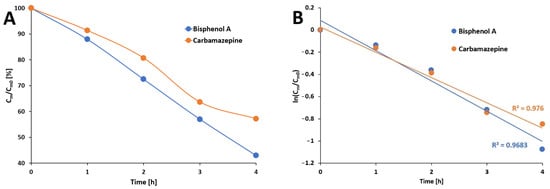 The changes in bisphenol A and carbamazepine concentrations after white light irradiation of the solution containing photocatalyst (A). The linear plot of photodegradation of targeted analytes (B).