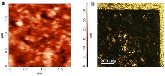 The 60 nm thick films made of graphene suspension on a SiO2/Si substrate had a resistance of ~50 Ω/sq, and the surface roughness on the area of 2 μm × 2 μm was 3 nm (see Figure 2a). Printing on photographic paper with strong surface relief results in significantly higher resistances and surface relief of the printed films. The sheet resistance of the graphene films depends on their thickness, as shown in Figure 3 (see also [22]). For the layer created by graphene screen printing, the resistance RGr demonstrates a strong non-linear dependence on layer thickness, with the RGr change in five orders of magnitude on the scale of 107–102 Ohm/sq. Measurements of resistance at different points of the antenna with a thickness ≥200 nm showed good reproducibility (±17%) along the antenna area. The antenna edge relief did not exceed 50 μm, as can be seen in Figure 2b.
