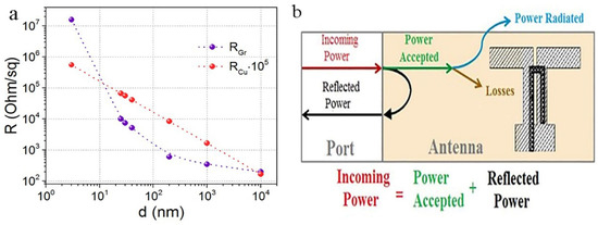 (a) Sheet resistances of the printed AGr layer and the resistance of Cu layer versus layer thickness. (b) Power distribution in the antenna.