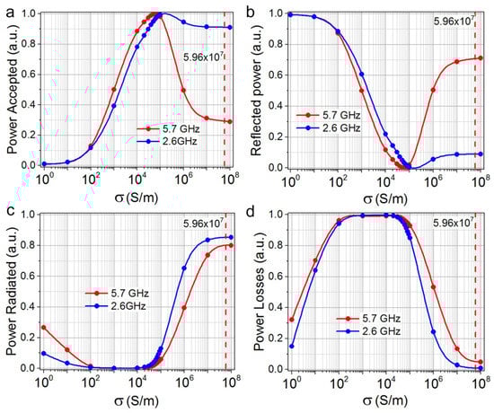The accepted and reflected powers’ dependence on the specific conductivity for ACu antennas is shown in Figure 4a,b. As it can be seen, for the specific conductivity of copper, the reflected power at a frequency of 2.6 GHz is 7 times less than that at a frequency of 5.7 GHz. At the same time, for the conductivity corresponding to the conductivity of AGr-antennas (σ~105 S/m), there is good input matching for both frequencies. The reflected powers are not large, but the reflected power at a frequency of the 5.7 GHz is less than for the 2.6 GHz and is close to zero for the material with the conduction of graphene σ = (0.5–1.0) × 105 S/m. In Figure 4c,d shows the distribution of the received antenna power, normalized to the power value. It can be seen (Figure 4c) that the difference between the radiation power and power losses for the two considered frequencies is insignificant.