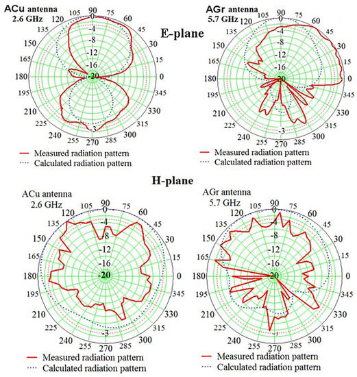 The normalized radiation patterns in polar coordinates in Figure 6 show that the correspondence between the experimental and calculated RPs is satisfactory, especially in the forward hemisphere, in the region of angles of 90 ± 60 degrees. Note that the main lobe of the RP of the experimental sample AGr antenna, in contrast to the main lobe ACu, antenna slightly deviates from the normal, and the contribution of the side lobes in the rear hemisphere increases, which does not significantly affect the performance of the AGr antenna at the frequency of 5.7 GHz. Small deviations of the RP AGr antenna most likely correspond to the influence of the power connector at a frequency of 5.7 GHz.