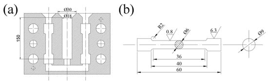 (a) mold drawing (unit: mm) and (b) tensile specimen bar (unit: mm).