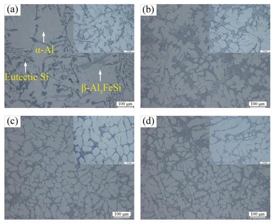 High magnification OM images of cast A380 alloys with different (La+Y) contents: (a) unmodified alloy; (b) 0.3 wt.%; (c) 0.6 wt.%; (d) 0.9 wt.%.