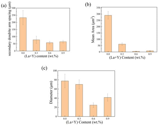 Figure 2 shows the OM images of matrix alloys with different contents of La+Y. As indicated by the arrow in Figure 2a, the matrix alloy is mainly composed of coarse α-Al grains, striped eutectic Si phase, and long needle-like β-Al5FeSi phase. In contrast, the addition of La and Y had a significant effect on modification of the cast microstructure. As exhibited in Figure 2b–d, the morphology of the eutectic Si phase in the alloy changes from strip-like to short fibrous or even granular. Meanwhile, both α-Al grains and β-Al5FeSi phase are well refined. The secondary dendrite arm spacing (SDAS) of α-Al grains, the area of Si phase, and the length of β-Al5FeSi phase were measured by IPP software, as shown in Figure 3. The results show that the A380 + 0.6 wt.% La/Y alloy exhibits the best refinement of microstructure. The SDAS and the length of β-Al5FeSi is decreased from 233 μm and 77.56 μm to 58 μm and 24.95 μm, respectively. The area of eutectic Si is also decreased from 289 μm2 to 6 μm2. Moreover, Figure 2c,d exhibit similar microstructure rather than improvement, which indicate that the increase of La+Y is not in favor of the microstructure optimization of the alloy anymore.
