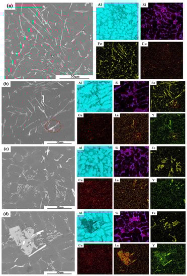 Figure 4 shows the SEM images of matrix alloys with different (La+Y) contents. The gray long needle-like phase and bright spot-like phase are observed in Figure 4a, which are inferred to be β-Al5FeSi phase and Al2Cu phase by combining with EDS and XRD analysis (Figure 5). As shown in Figure 4b, some bright short rod-like phases are also observed, which are inferred to be Al11La3 and Al3Y phases in combination with EDS analysis and corresponding binary phase diagram [20,21]. Comparing the EDS of Fe with La and Y, as shown in Figure 4a–d, it can be seen that the rare earth phase of the alloy does not contain Fe elements. So, the red circle in Figure 4b shows some rare earth phases attached to the needle-like β-Al5FeSi phase. According to the previous research [22], the rare earth elements can hinder its growth by attached to the β-Al5FeSi phase. Moreover, some letter-like α-Al8Fe2Si phases can be observed in Figure 4c. The mechanical properties of the alloy are much less impaired by the α-Al8Fe2Si phase compared to the needle-like β-Al5FeSi phase. In addition, as shown in Figure 4d, the bulk gray La-rich phases are observed in the A380 + 0.9 La/Y alloy, which can affect the mechanical properties of the alloy. On the other hand, the equilibrium partition coefficient of copper atoms is reduced because the enriched La and Y in the solid–liquid interface front hinders the diffusion of Cu atoms. Therefore, the solubility gradient of Cu in the liquid phase at the interface front increases, which increases the compositional supercooling of the alloy. So, the intensity of the peaks from the Al2Cu phase noticeably decreases with the addition of alloying elements, which is consistent with the XRD (Figure 5).