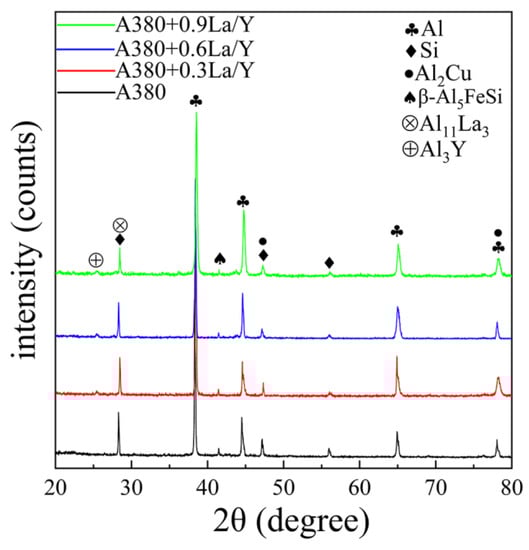 XRD patterns of A380 alloys with different (La+Y) contents.