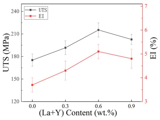 The mechanical properties of matrix alloys with different contents of La+Y are tested, as shown in Figure 6. The ultimate tensile strength (UTS) and elongation index (EI) of the matrix alloy are 175.2 MPa and 3.7%, respectively. The A380 + 0.6 wt.% La/Y alloy has the best UTS and EI, which reach 215.3 MPa and 5.1%, respectively. These represent an increase of 22.9% and 37.8%, respectively, compared to the base alloy. However, the UTS and EI start to decrease when the addition of La+Y reached 0.9 wt.%.