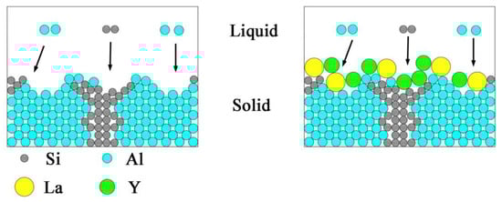 In addition, according to Hume–Rothery criterion [29], the solid solution will be very small when the difference of atomic radii is more than 15%. Therefore, rare earth elements will be gathered at the solid–liquid interface front during solidification. The radii and relative atomic masses of La and Y atoms are very different from those of Al and Si atoms. It is difficult for La and Y atoms to enter the lattice of α-Al and eutectic Si. Therefore, the atoms of La and Y distribute on the Si surface and dendrite surface at the front of the solid–liquid interface can act as a hindrance to the growth of Si phase and α-Al dendrites, as shown in Figure 8. As a result, solute diffusion and exchange will be inhibited, leading to a more moderate accumulation of solutes on the Si surface. Finally, the growth rate of eutectic Si is slowed down and the coordinated growth of α-Al and Si is achieved.