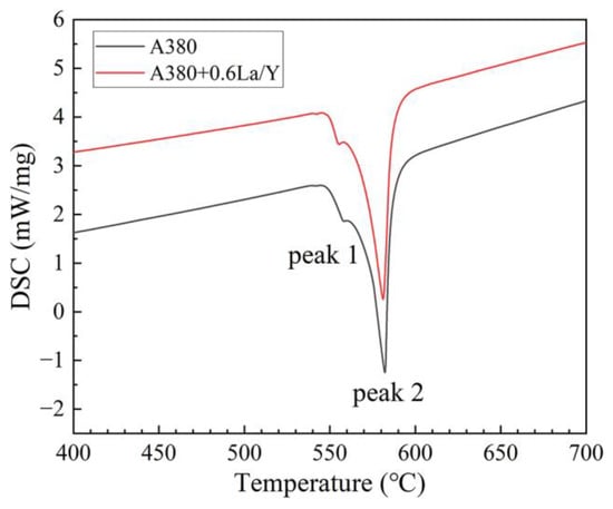 DSC curves for the La/Y-free and La/Y-contained A380 alloys.