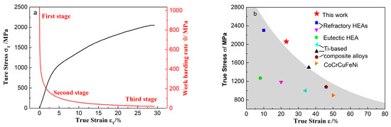 (a) The work hardening rate and true stress versus true strain curves engineering stress-strain curve of Φ3 mm Ti40Ni40Cu20 alloy; (b) compressive properties compared to some other advanced alloys.