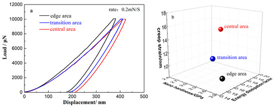 According to the load–displacement (L–D) curve results and the Oliver–Pharr method, the calculated nano-hardness in the edge, transition and central regions increases, whereas the plastic deformation, energy consumption factor and creep show the opposite trend.