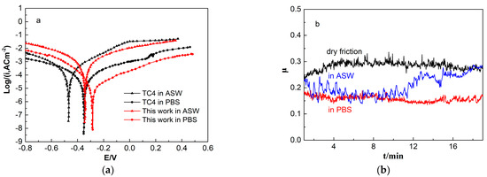 (a) Potentiodynamic polarization curves of Ti–6Al–4V and Ti40Ni40Cu20 BMGC in ASW at 298 K and PBS at 310 K; (b) friction coefficient of Ti40Ni40Cu20/GCr15 under dry friction and in ASW, PBS solutions.