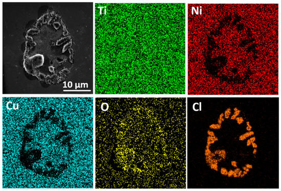 The pH value of the etching pits decreases as the reaction proceeds, leading to accelerated pitting. As illustrated in Figure 4a, the corrosion current density increases after pitting occurs in the artificial seawater. Meanwhile, the concentration of the newly formed TiO2 increases to a certain extent, which hinders further development of the pitting. Thus, the polarization curve presents repassivation after the pitting occurs. In addition, the corrosion pit and its surrounding corrosion structure can be observed in Figure 5. As can be seen, no obvious corrosion products are found in the rest area. EDS mappings show that the O elements distribute on the surface, concentrated in the corrosion area. The Ti content is greater and with a more uniform distribution on the surface. The Cl is mainly concentrated on the boundary of the uncorroded region and the defects-caused corroded region. The Ni and Cu elements were observed to uniformly distribute outside the corrosion area.