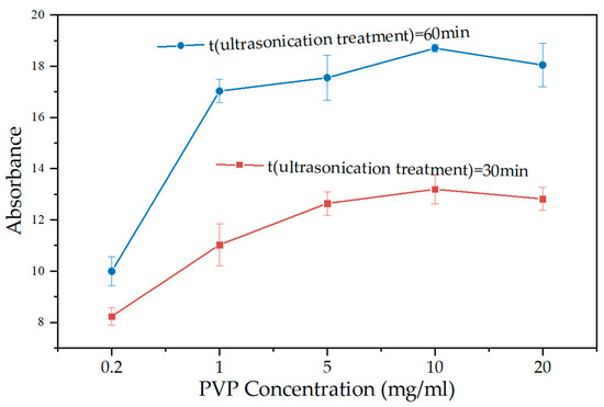 Figure 2 shows the dispersion effect of PVP at various concentrations. The absorbance of GNPs suspension steadily increased as the PVP concentrations increased to 10 mg/mL and then decreased for the PVP concentrations exceeding 10 mg/mL. These experimental results were similar to findings for other dispersed stabilized nanomaterials [28,38]. The reason for this phenomenon was that there was a limiting concentration (critical micelle concentration), beyond which the adsorption of PVP on GNPs reached saturation [39,40]. The hydrophobic groups of PVP tended to escape from the aqueous environment and form an inner core by self-polymerization inside the solution. In contrast, hydrophilic groups faced outward to form a shell in contact with water and formed a gel cluster [40,41].
