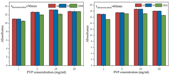 Figure 3 shows the absorbance of GNPs suspension at different concentrations after resting for 1 d, 3 d, and 120 days. No significant difference was observed after the 1 and 3 days of rest, and there was a mild decrease in absorbance up to 120 days. Figure 4 shows the rate of absorbance loss upon GNPs addition after 3 d and 120 days. When the PVP concentration of 10 mg/mL, the rate of absorbance loss was extraordinarily low. At 120 days, the absorbance of all GNPs suspensions at different PVP concentrations significantly decreased, particularly for the concentrations of 10 and 20 mg/mL. When the PVP concentration was 10 mg/mL, the rate of absorbance loss was 7.81% and 8.04% after 30 min and 60 min ultrasonication times, respectively. Such a low rate of absorbance loss indicates that the GNPs suspension of 10 mg/mL concentration had a good dispersion stability [42]. Meanwhile, there was no noticeable color change in GNPs suspensions at 3 and 120 days. Therefore, it may be concluded that the optimal PVP concentration is 10 mg/mL.