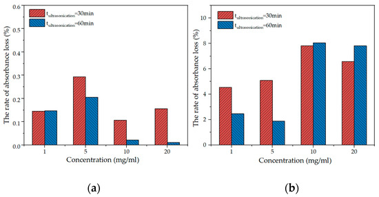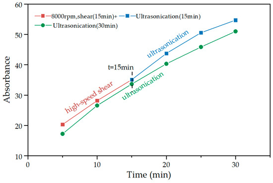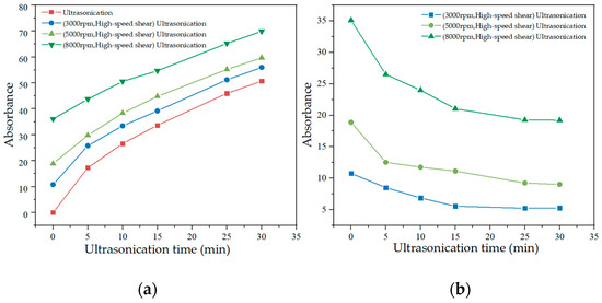 Figure 7. (a) A comparison between the absorbance of GNPs suspension under ultrasonication with and without high-speed shear; (b) The difference value between the absorbance of GNPs suspension under ultrasonication with and without high-speed shear.