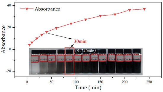 Figure 5. Absorbance of GNPs suspension in different ultrasonication time (inset: sample image).