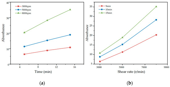 Figure 6. Absorbance of GNPs suspension; (a) different shear time; (b) different shear rates.
