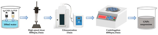 The GNPs suspension preparation flowchart is shown in Figure 1. Three steps (a, b, c) were taken to optimize PVP concentration, ultrasonication time, and high-speed shear time and rate.
