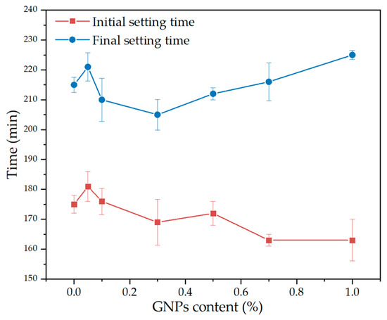 Figure 10 shows the setting time of cement paste at various GNPs dosages. With the increase in GNPs dosage, the initial setting time tended to increase initially and then decrease. When the GNPs dosage was 1.0%, the initial setting time of cement paste decreased the most (163 min). This is because GNPs possess a large specific surface area, which could provide more nucleation sites during cement hydration and promote the early hydration of cement [13]. The final setting time increased to GNPs content of 0.05 wt% and then decreased. This could be attributed to the presence of a large number of functional groups (hydroxyl, hydroxy) on the surface of GNPs [41], which produced an electrostatic reaction in the alkaline environment and subsequently caused agglomeration and flocculation phenomenon [47]. The higher GNPs dosage also decreased the hydration degree of the cement paste [48]. However, such influence was not significant in the initial setting time. The differences in setting time are within 20 min compared with ordinary cement paste. Thus, all the mixing contents meet the use requirements.