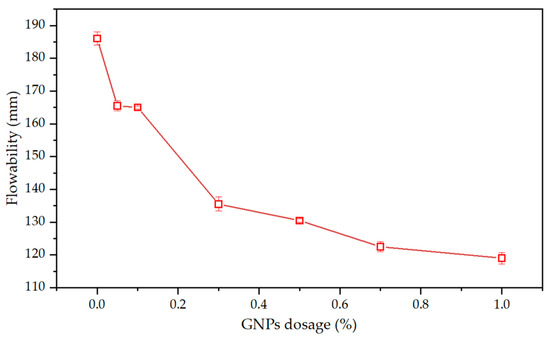 As shown in Figure 11, the flowability decreased from 186 mm to 119 mm as the GNPs dosage increased. The reasons can be explained as follows: First, since the high specific surface area of GNPs could adsorb more water from the cement paste to its surface, resulting in a reduction of free water [41,49]. Second, when GNPs contacted with cement particles, the functional groups on its surface interacted electrostatically with those particles and subsequently produced the agglomeration and flocculation phenomenon [47]. This is due to the fact that the flocs sequestered a large amount of free water from the solution, which reduced the flowability of the fresh cement mortar [43]. Similar results have been demonstrated in other studies [43,50,51].