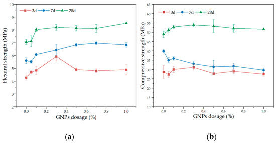 Figure 12a,b shows the flexural and compressive strength of cement mortar with various GNPs dosages at 3 d, 7 d, and 28 d ages. At 3 d age, when the dosage of GNPs was less than 0.3 wt%, the flexural strength increased with the dosage increasing, while it decreased when the dosage of GNPs was greater than 0.3 wt%, which was similar to the compressive strength. At 7 d age, the higher GNPs dosage increased the flexural strength while it decreased the compressive strength. At 28 d age, both the flexural strength and compressive strength increased with GNPs dosage increasing. It should be noted that the 0.3 wt% GNPs dosage was optimal for strength gain.