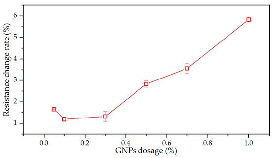 As shown in Figure 13, the rate of change in electrical resistance of GNPs first decreased and then increased slowly before 0.3 wt%, followed by a rapid increase from 0.3 wt% to 1.0 wt%. The rapid increase phenomenon was consistent with the percolation theory stage [55]. This theory referred to when the dosage of these GNPs in cement-based materials reached a critical value (0.3 wt%), and the conductivity increased abruptly. Furthermore, it should be noted that when the dosage of GNPs reached 1%, the rate of electrical resistance was 5.8%, which is enough to monitor structural health.