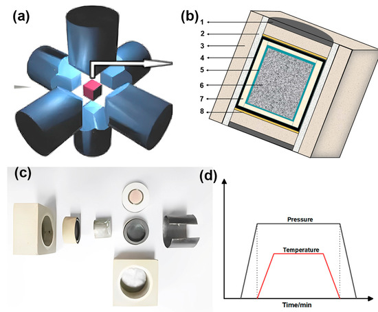 Schematic diagram of UHP sintering assembly: (a) Six-anvil pressure diagram; (b) Cross section diagram: 1: conductive steel hat, 2: dolomite, 3: pyrophyllite composite cavity, 4: graphite chips, 5: molybdenum cup, 6: raw mixed powders, 7: salt composite, 8: copper chip; (c) Physical disassembled image; (d) Sintering process curve.
