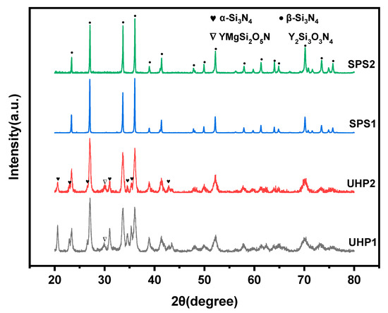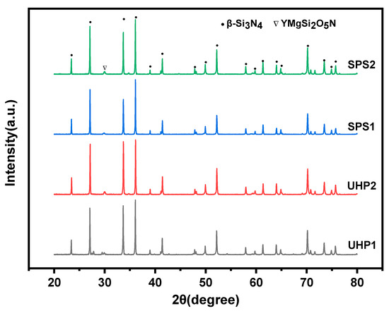 Figure 3 shows the XRD diffraction of the sintered samples by SPS at 1550 °C for 3 min and UHP sintering at 1550 °C for 15 min. It demonstrates that the prominent diffraction peaks of sample SPS1 and SPS2 were β-Si3N4 with no trace of α-Si3N4. The fragile crystalline phase is Y2Si3O3N4. In contrast, the diffraction peaks of UHP1 and UHP2 are composed mainly of β-Si3N4, residual α-Si3N4, and the crystalline phase of YMgSi2O5N. The content of β-Si3N4 was calculated in Table 3. It can be seen that the content of β-Si3N4 in the SPS sintered samples all reached 92%, while the range of β-Si3N4 in the UHP sintered samples was lower, at about 87%.