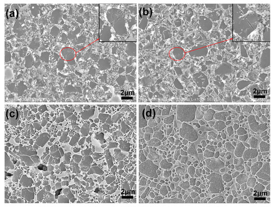The SEM micrographs of the etched surface of the samples sintered by SPS and UHP at 1550 °C are shown in Figure 4. The microscopic morphology of the samples shows a small number of large grains (>2 μm) distributed among small submicron matrix grains. The difference is that the number of large-sized grains of the UHP samples is much smaller. Cracks can be seen in the large grains of the high-magnification images. Chang and Rhodes [29] investigated the high-pressure sintering of uranium carbide at 4.6 GPa, indicating that sliding of the grain boundaries and fragmentation are significant sintering mechanisms. The coarse β-Si3N4 powder employed in this study has a particle size of 1.8–2.7 μm, and big grains are cracked or crushed at a high pressure of 5 GPa. As a result, the UHP samples exhibit a greater number of small grains. Due to the inclusion of some fine α-Si3N4 powder, the UHP1 and SPS1 samples have more small grains than samples UHP2 and SPS2. Moreover, there is a small number of pores in Figure 4c compared to Figure 4d, which is consistent with the lower density of sample SPS1.