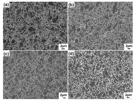 Figure 6 displays the SEM micrographs of the etched surfaces of the four samples after heat treatment at 1750 °C for 3 h. It is observed from Figure 5a that a few abnormal grains are distributed in the fine matrix grains. According to Kong, J. H. [30], the driving force for aberrant grain growth may be dependent on the status of the effective space around a grain. During UHP sintering, many large grains were fragmented into small grains, leaving a small number of large grains as the nucleus, whereas the space around each nucleus was supersaturated. The residual α-Si3N4 and small β-Si3N4 grains dissolved in the liquid phase during heat treatment and re-precipitated on the surface of the large β-Si3N4 nucleus to promote the growth of abnormal grain. In Figure 5b, some large elongated grains were distributed among small rod-like matrix grains that formed an interlocking structure due to a greater number of large residual grains than the sample UHP1 after UHP sintering. On the contrary, it shows a microstructure with several grains greater than 2 μm in diameter distributed among the fine matrix grains in Figure 5c,d. Research [22,31] indicated that with the excessive addition of the nuclei, the effective growth spaces around the nuclei are insufficient and suppress the growth of grains due to the steric hindrance. After SPS, α-Si3N4 almost transformed completely into β-Si3N4 in the SPS samples, with excessive large grains as the nucleus leading to the suppression of grain growth, resulting in a microstructure with a smaller aspect ratio. Compared to sample SPS2, sample SPS1 contains more small-sized grains due to the addition of some fine α-Si3N4 powder to the raw material powder. The grain boundary phase is re-melted to form the filling of the liquid phase, and the Ostwald ripening of the β-Si3N4 grains promotes the elimination of the pores in sample SPS1 after heat treatment.