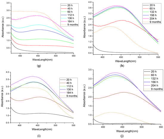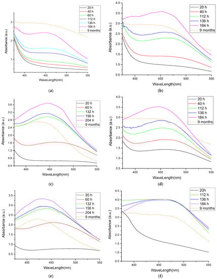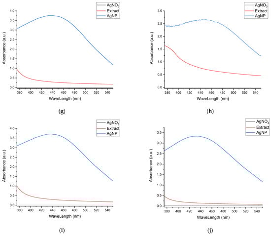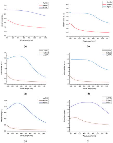 The (phyto)synthesis of silver nanoparticles can be successfully observed using UV-Vis spectrometry, with silver nanoparticles exhibiting absorption maxima in the 400–550 nm region. Using this method, primary evaluations can be made in regard to both the sizes of the particles obtained and their stability [24]. The stability of the phytosynthesized AgNPs was observed over a period of several months. For the determinations, a Rigol Ultra 3660 UV-Vis spectrometer (Rigol Technologies Inc., Beijing, China, optical resolution 0.5 nm) was used, in the wavelength range of 375–550 nm.