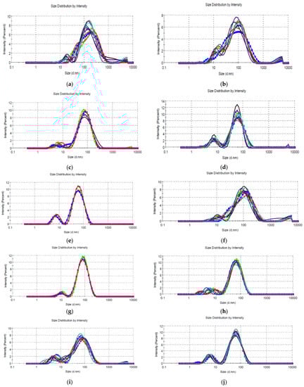 Figure 4. Size distribution by intensity, determined via the DLS technique, for (a) sample EM5; (b) sample EM2.5; (c) sample EM2; (d) sample EM1.25; (e) sample EM1; (f) sample EE5; (g) sample EE2.5; (h) sample EE2; (i) sample EE1.25; and (j) sample EE1.