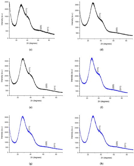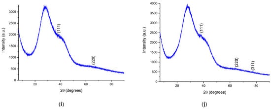 Figure 5. Diffractograms of the phytosynthesized nanoparticles: (a) sample EE5; (b) sample EE2.5; (c) sample EE2; (d) sample EE1.25; (e) sample EE1; (f) sample EM5; (g) sample EM2.5; (h) sample EM2; (i) sample EM1.25; (j) sample EM1; Miller indices are presented on each image.