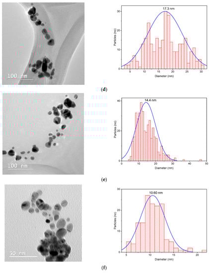 Figure 6. TEM images and size distributions obtained for the phytosynthesized nanoparticles: (a) sample EE5; (b) sample EE2; (c) sample EE1; (d) sample EM5; (e) sample EM2; (f) sample EM1.