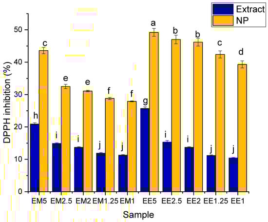 Figure 7. Antioxidant activity (expressed as DPPH inhibition—%) for the phytosynthesized nanoparticles and corresponding extracts. Values represent the mean ± SE, n = 5 per treatment group; values without a common lowercase letter differ statistically (p < 0.05) as analyzed via one-way ANOVA and the TUKEY test.