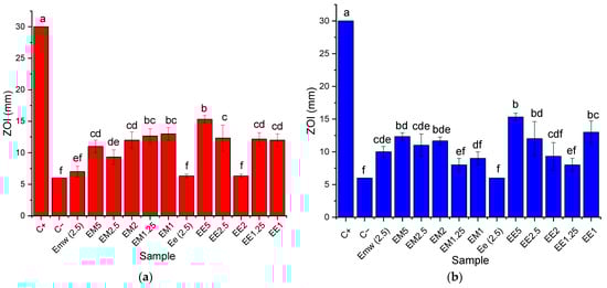 Figure 8. Antimicrobial activity of the tested samples against (a) Candida albicans ATCC 64548; (b) Escherichia coli ATCC 8738. C+—positive control (as described in Section 2); C−—negative control (water); Emw (2.5)—microwave-assisted extract at 2.5 mg/mL; Ee (2.5)—classical temperature extract at 2.5 mg/mL. Values represent the mean ± SE, n = 3 per treatment group; values without a common lowercase letter differ statistically (p < 0.05) as analyzed via one-way ANOVA and the TUKEY test.