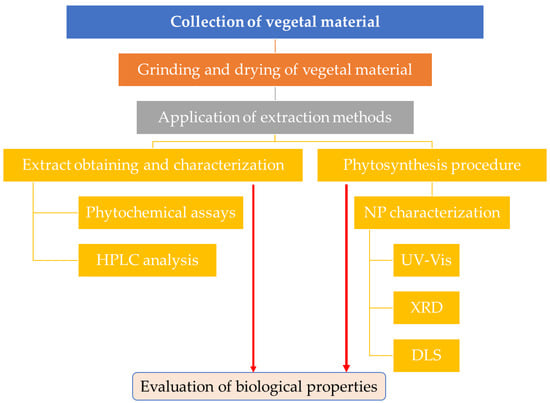 One of the main factors affecting the morphology and dimensions of metal nanoparticles is the composition of the extract used. In order to elucidate the composition, phytochemical tests were selected (the total content of phenolic compounds, and the total flavonoids content), whereas high-precision liquid chromatography (HPLC) was applied to quantify the target compounds. All reagents were used as received, without further purification.
