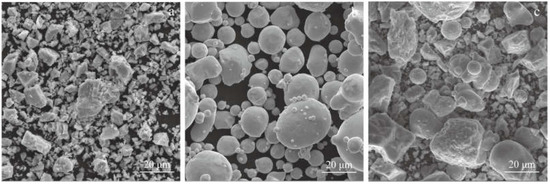 SEM images of the powders: (a) Ti powder; (b) Ni powder; (c) Ni-Ti blended powders.
