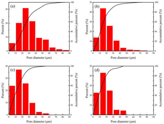 The relation between pore size distribution of sintered specimen with sintering temperature: (a) 950 °C; (b) 1000 °C; (c) 1050 °C; (d) 1100 °C.