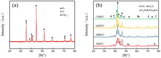 The Ti powder used in the experiment was obtained by the method of hydrogenation dehydrogenation and the particle size was small (mean diameter of 6.37 μm), so there was TiD1.5 phase in Ni-Ti blended powders. In Figure 5b, NiTi, Ni3Ti and Ti2Ni phases were identified, which illustrated Ni and Ti powders have a reaction during sintering densification. The presence of TiO2 phase was the result of oxygen contamination from the organic reagent or protective atmosphere. As can be seen from Figure 5, the temperature has an important effect on the phase composition of the sintered specimen. At the temperature of 950 ℃, the predominant phases were Ni3Ti and Ti2Ni, and the pure Ni peak was also being detected. The insufficient atomic diffusion between the Ni and Ti at low temperature may be responsible for the phenomenon. During heating, the following chemical diffusion reactions take place between nickel and titanium powders [29]: