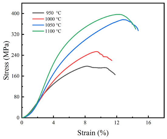 Figure 6 reveals that the sintered specimen under different temperatures presented similar mechanical behavior, and the compressive stress-strain curves can be divided into the following three stages [32,33]: (1) Linear elastic deformation stage, where the pore wall responded to elastic compression and the stress increased linearly with the strain. (2) Plastic yield deformation stage, where plastic deformation occurred preferentially around the micropores due to stress concentration, and then extended to the whole pore wall accompanied by rapid crack propagation. (3) Densification and rupture stage, where the pore walls would collapse and the rupture of the specimen took place. It was also found that the maximum stress strength and the maximum strain were promoted dramatically with the rise in temperature. As shown in Figure 7, as the temperature rose, both the compressive strength and elastic modulus of the sintered porous specimen gradually improved. When the sintering temperature was raised from 950 °C to 1100 °C, they increased from 185 MPa and 3.45 GPa to 390 MPa and 6.9 GPa, respectively. It is widely known that the mechanical properties of porous materials depend on their microstructure, such as pore size and shape, porosity, the densification degree of the pore wall and the phase composition. Particularly, the sharp edges of the irregular pores are prone to stress concentration, which will lead to the deterioration of the strength and plasticity of the porous materials. It can also be found from Figure 2 and Figure 5, that with the rise in temperature, the relative density and the content of NiTi phase and the densification degree of the pore wall increased, while the pore shape became more regular. All of these will improve the strength of sintered porous NiTi. In additional, the elastic modulus of the porous NiTi alloys within 3.45–6.9 GPa may meet the requirement of some natural bone for elastic modulus (3–20 GPa for cortical bone) [34,35].