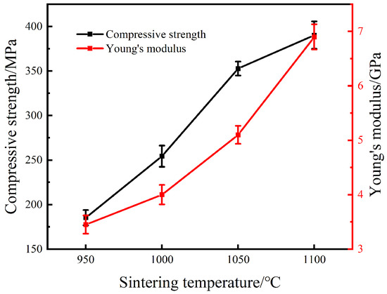 The relation of the compressive strength and elastic modulus of the specimen with its sintering temperature.