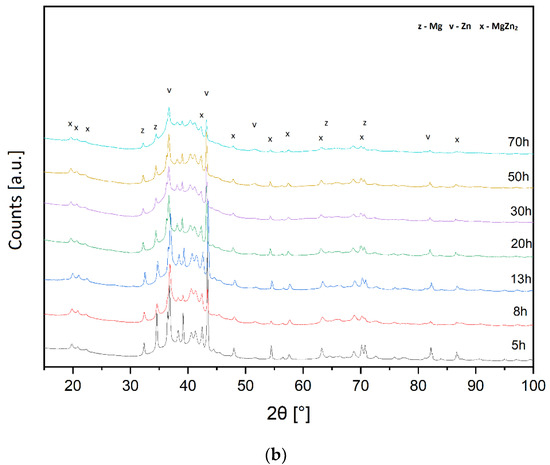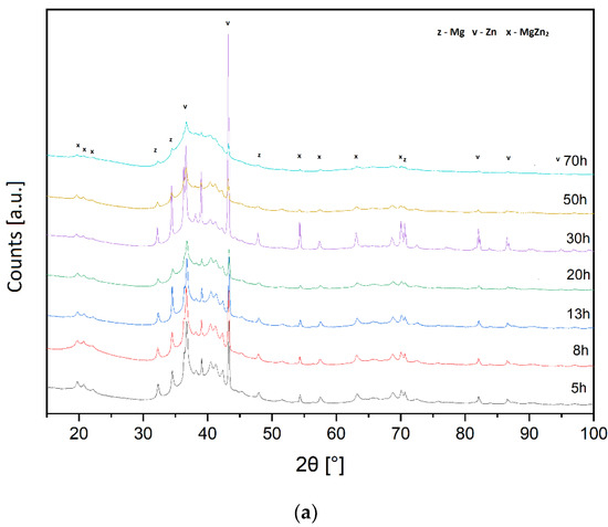 The analysis of the diffraction patterns of alloys with silver addition (Figure 1 for Ag1 = 1 at.% and Figure 2 for Ag2 = 2 at.%) showed that the alloy structure contains the following phases: MgZn2 and Zn and Mg traces. The amorphization process is slow and was observed only after 50 h of milling for the Ag1 alloy and 70 h of milling for the Ag2 alloy. The diffraction patterns show a gradual disappearance of the diffraction lines of zinc, which dissolves in magnesium to form a hexagonal solid solution of Mg (X), where X represents the alloying additions, i.e., Zn, Ca, and Ag. According to the presented results of the X-ray analysis and the analyses of the chemical composition of the ground powders, the presence of impurities resulting from the abrasion of the material of the spheres and vessel walls was not observed.