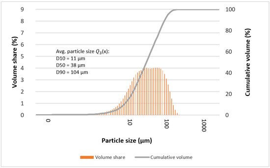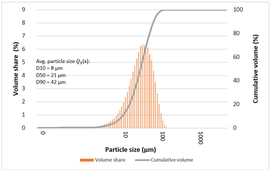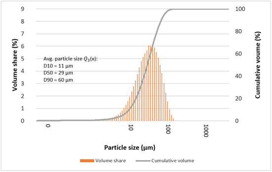 The particle size distribution of the alloys from the Mg66−xZn30Ca4NMx system (where x = 1, 2) was determined using the Analyssette 22 MicroTec + apparatus (Fritsch, Weimar, Germany) by performing measurements in ethyl alcohol.